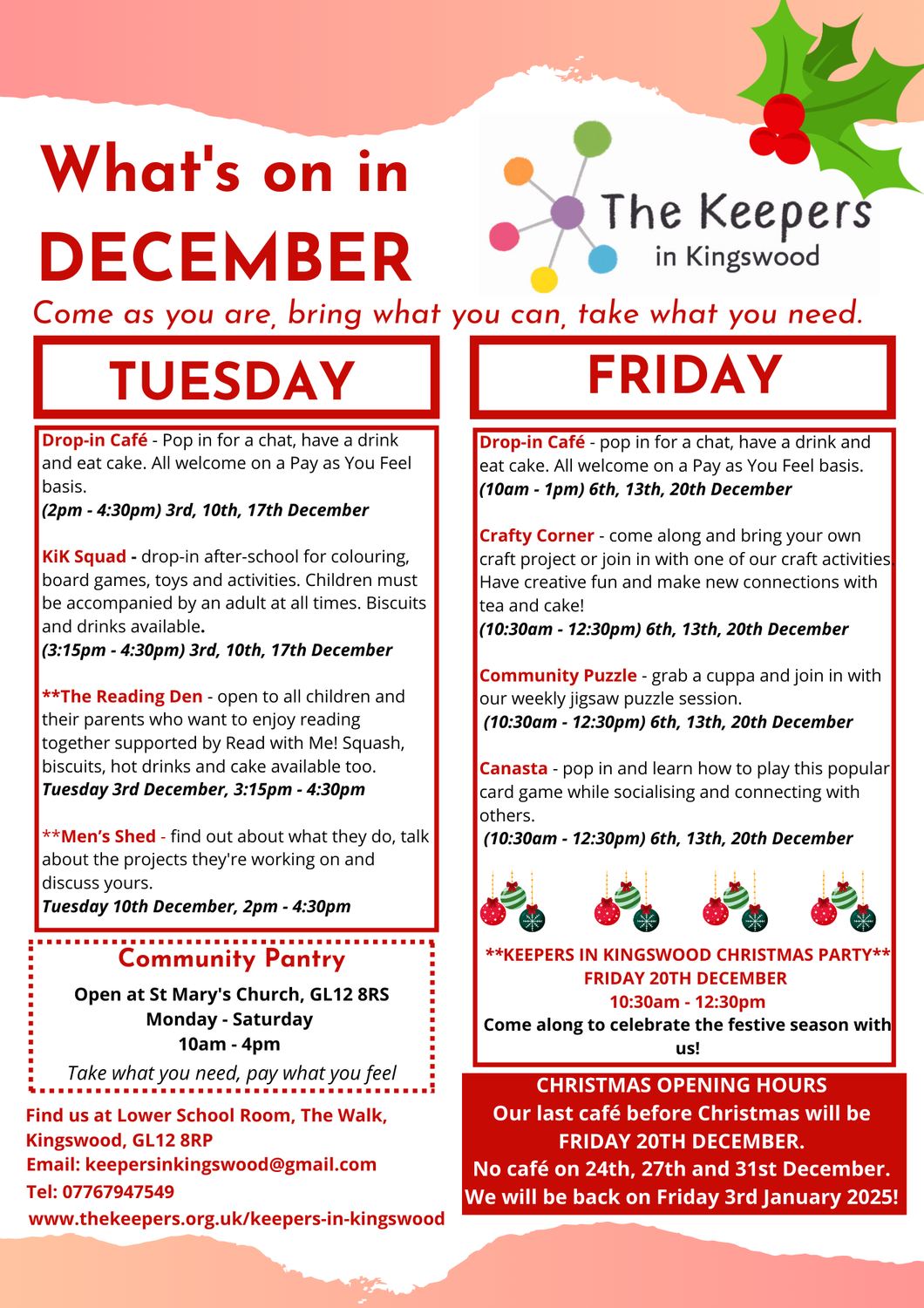 Details of What's on in December from The Keepers in Kingswood including the Drop in Café on Tuesdays and Fridays. Also Crafty Corner on Fridays where you can either bring your own craft project or join in with one of their craft activities.