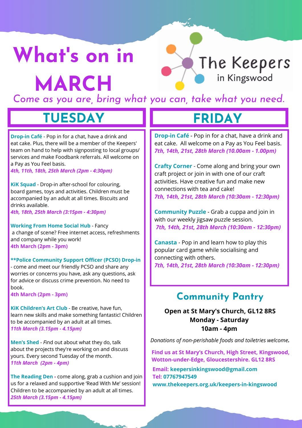 Details of What's on in March from The Keepers in Kingswood including the Drop in Café on Tuesdays and Fridays. Also Crafty Corner on Fridays where you can either bring your own craft project or join in with one of their craft activities.