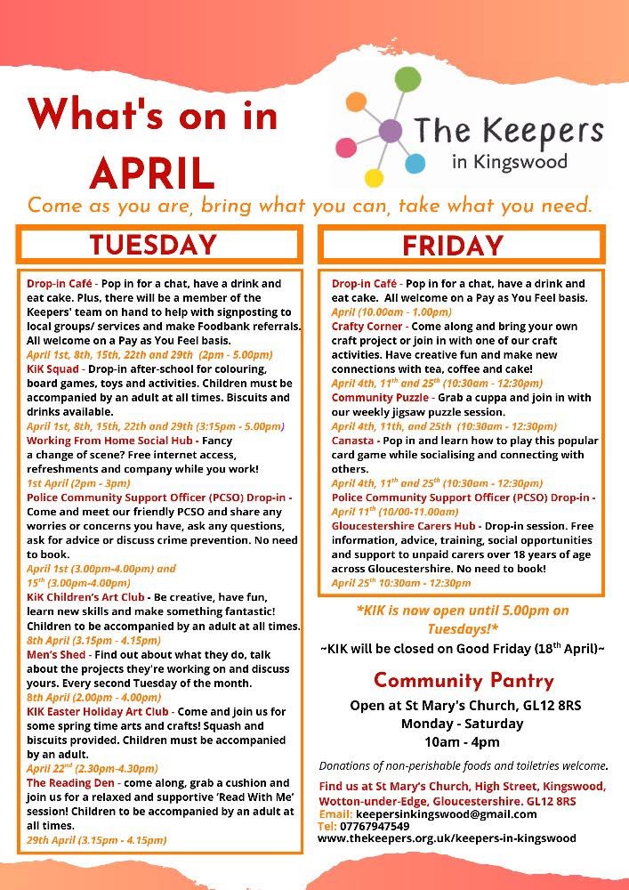 Details of What's on in April from The Keepers in Kingswood including the Drop in Café on Tuesdays and Fridays. Also Crafty Corner on Fridays where you can either bring your own craft project or join in with one of their craft activities.
