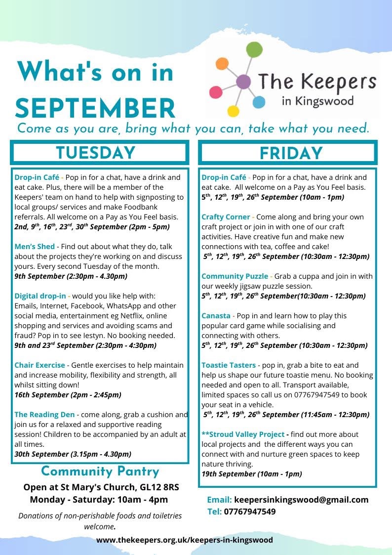 Details of What's on in September from The Keepers in Kingswood including the Drop in Café on Tuesdays and Fridays. Also Crafty Corner on Fridays where you can either bring your own craft project or join in with one of their craft activities.